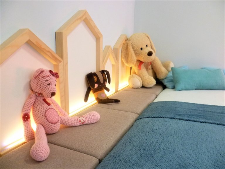 Prostrorný dětský pokoj byl navržen jako rostoucí, veškerý nábytek je zatím pro dítě ve školce situován u podlahy, postupem času lze doplnit nástěnné skříňky. V případě potřeby lze jednoduchým vyjmutím části skříněk doplnit i další postel pro sourozence.