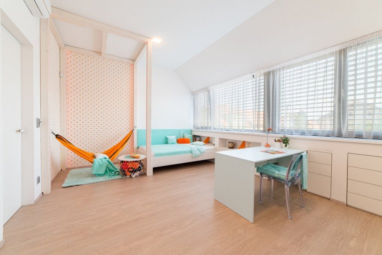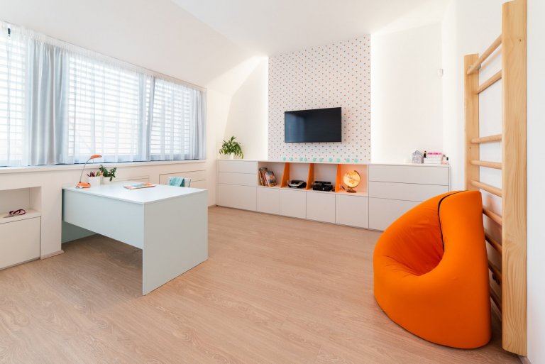 Dětský pokoj je určen pro velmi aktivní a sportovně založenou školačku. Místnost poskytuje dostatek místa na různé herní a sportovní prvky a díky samostatné šatně není zapotřebí velké množství…