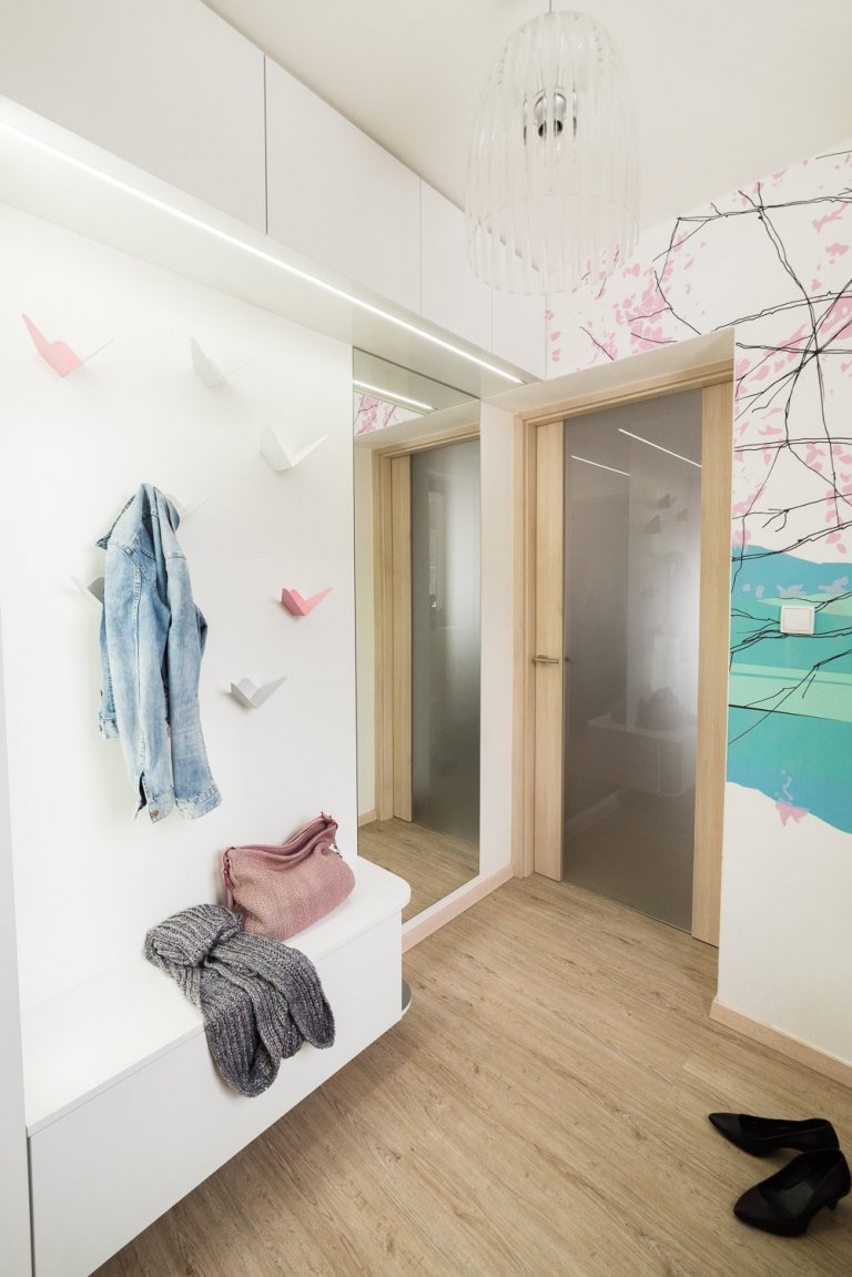 Dominantou malého zádveří RD je tapeta s motivem bříz od finské značky Marimekko, která je známá svým osobitým severským designem. Netradiční jsou i věšáky, vše barevně sladěno a doplněno o nejnutnější vybavení k sezení a ukládání.