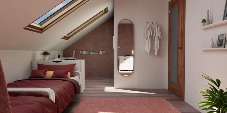 Paní domu si přála navrhnout pokojíček pro dvě dcerky zatím předškolního věku. V plánu je pokojíček zařizovat postupně a vizualizace má sloužit jako plán konečného vybavení. Pro rozmístění nábytku je omezující šikmina střechy.