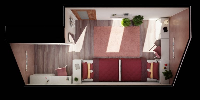 Nábytek je navržen v neutrální bílé barvě, doplňky v odstínech vínové a růžové. Výrazná růžovočervená výmalba je uplatněna na odlehlejší strany místnosti, čímž bude pokoj působit opticky kratší.