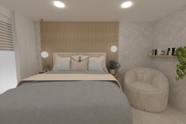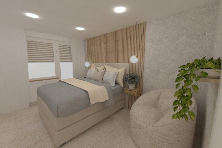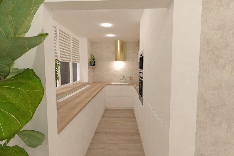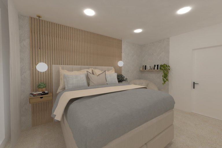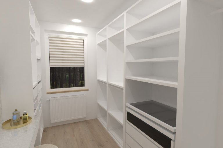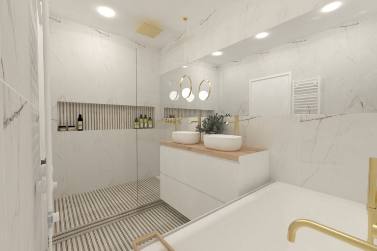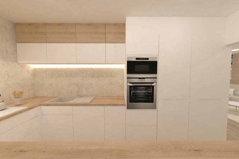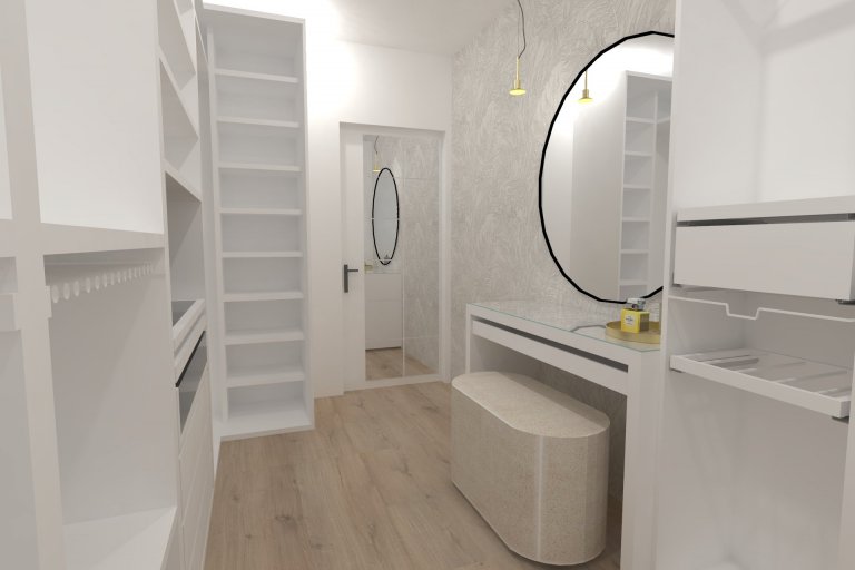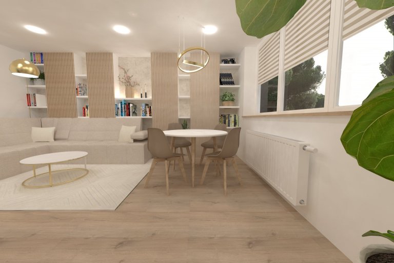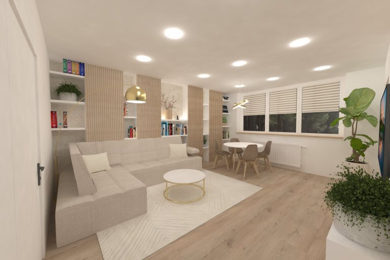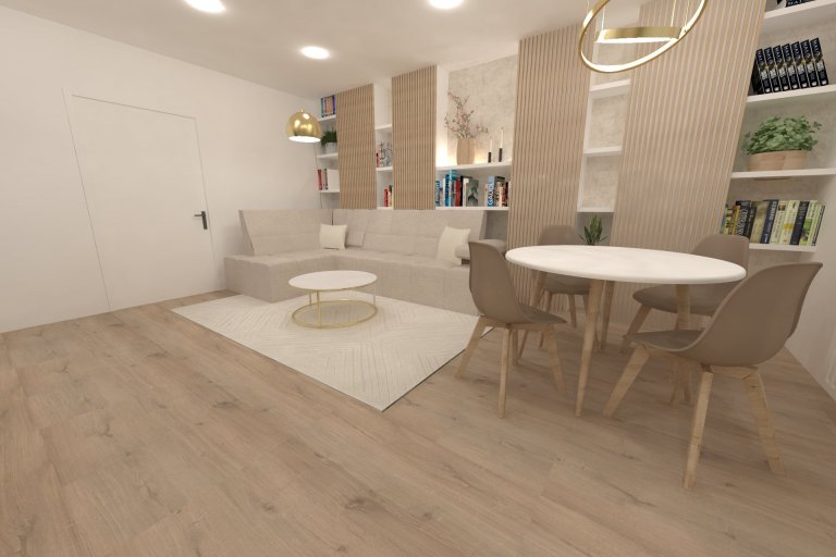 Vizualizace bytu 3+1 pro mladý pár. Barvy které jsem v bytě použila jsou bílá, béžová a zlatá. V obývacím pokoji vznikla nádherná prostorná knihovna, jelikož majitelé jsou velcí čtenáři. v celém bytě jsou sladěné materiály do posledního detailu.