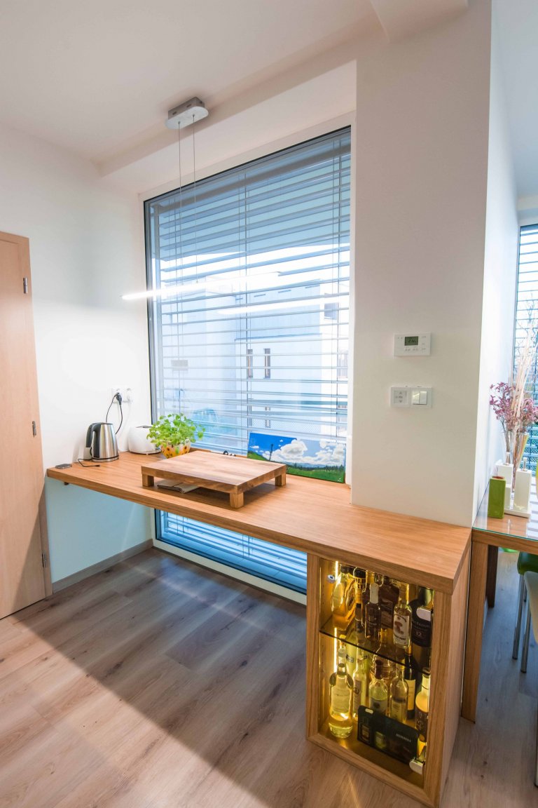 Dobře funguje i protilinka „levitující“ před oknem. Oproti našemu záměru – zachovat kontinuitu protilinky a jídelního stolu nakonec sešlo. Nicméně i stávající řešení s volným stolem funguje dobře. Stůl má víc v prostoru.