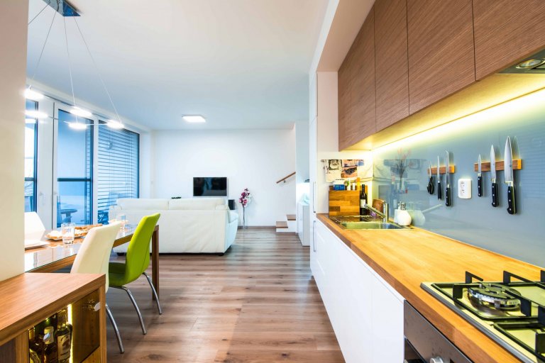Jednoduchá barevnost staví na kombinaci bílé a dubové dýhy. Motivem bytu je v první řadě ohromující výhled celou podélnou stěnou obývacího pokoje s jídelnou a pak také ložnice. Majitelé tento základní prostor oživili židlemi a doplňky.