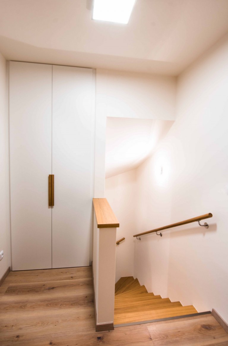 Vstupní prostory fungují podle očekávání. Zrcadlové dvířka prostor zvětšují. Knopky, botníček a police poskytují dostatek prostoru pro odložení věcí, ale nepobízejí k přílišnému zaneřádění prostoru. Jedny z dveří schovávají vstup do skladu po schodištěm.