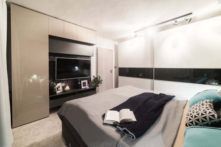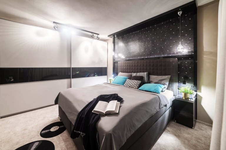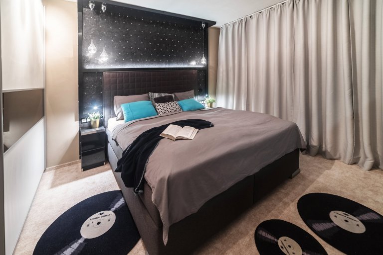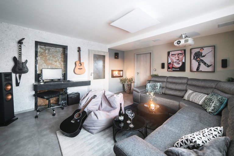 Prostor obývá velmi milý pán - filmový a hudební fajnšmekr. Místo televize je v pokoji promítací plátno, které se spouští ze sádrokartonového podhledu ve stropě. Když je plátno srolované, stěna přesto nepůsobí prázdným dojmem. Zdobí ji podsvícená kamenná dýha (břidlice), která je nalepená na skle a díky tomu lze kamennou dýhu podsvítit LED pásky. Niku, kde byl dříve bar, jsem využila pro pracovní koutek, který je také zdoben kamennou břidlicí.