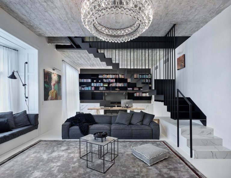 Obývací pokoj – protější stěna ke kuchyni je věnována audio / video sestavě s televizí, v nice je pak umístěn krb na biolíh. Proti krbu je umístěné křeslo na čtení. Citlivým doplněním svítidla nad jídelním stolem jsou nástěnné lampy s tlustou čočkou, které opět vytvářejí velmi zajímavou kresbu světla na stěnách. Pro změkčení interiéru jsou velká okna opatřena lehce šedým lehkým závěsem.