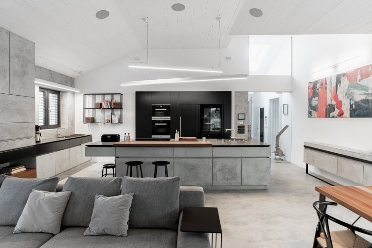 Koncept /barevnost /materiály - Základním konceptem je otevřený obytný pokoj s kuchyní a jídelnou ve středu a na něj navazující dvě soukromé části s ložnicemi. Hlavním momentem v materiálovém konceptu je použití betonových stěrek na podlahu a stěny. Díky tomu vzniká podklad pro umístěný dřevěné kuchyně ve velké ploše. Celá barevnost je tónech šedé, jediným kontrastem je přírodní tón kuchyně.