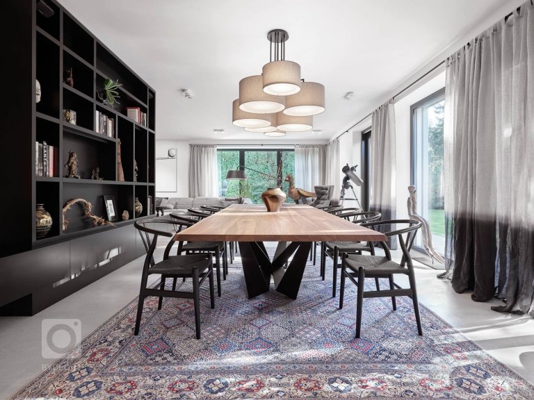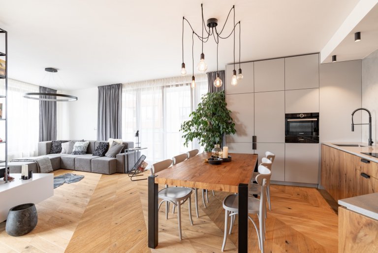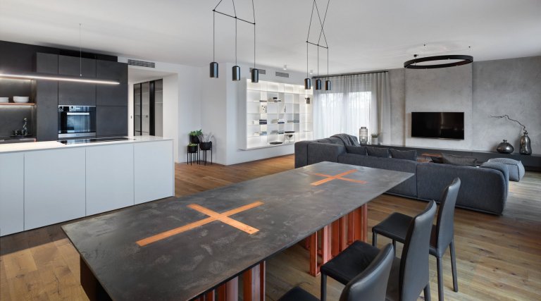 Kuchyně / jídelna – kuchyně je tvořena šedým ostrůvkem s pracovní deskou z broušeného hliníku, která přechází i na boky kuchyně. Vysoké skříně v zadní částí jsou z drásané katrované dubové dýhy. Na kuchyni materiálově navazuje dlouhý jídelní stůl v kombinaci opět dubová dýha a černý lak. Židle jsou v černé konstrukci s přírodním výpletem. Nad jídelním stolem je umístěné dominantní svítidlo v podobě obráceného květu z polykarbonátu, který dosahuje velmi zajímavých světelných efektů lomem světla. Svou hravou podobou výrazně kontrastuje s jinak minimalistickým strohým interiérem.