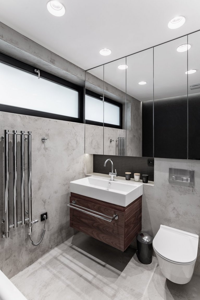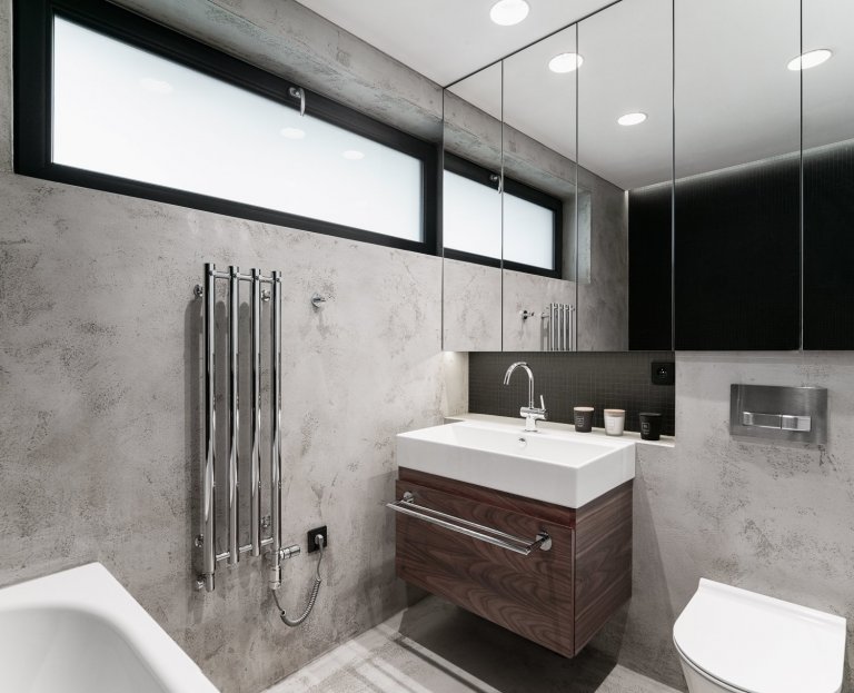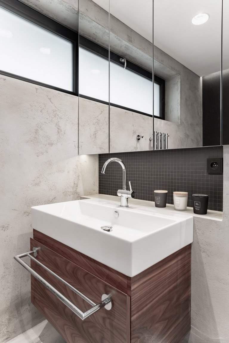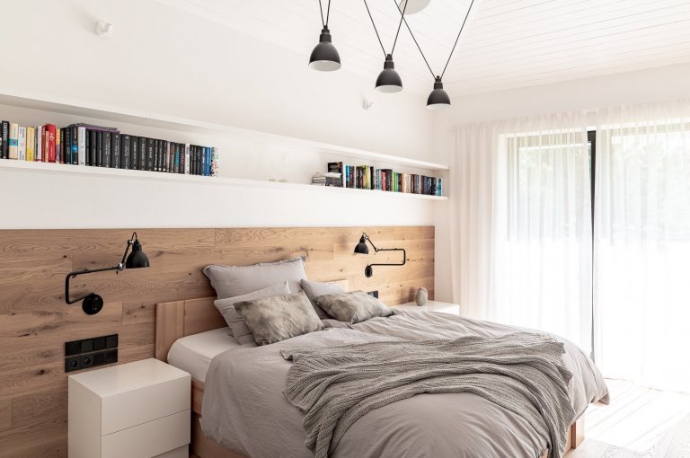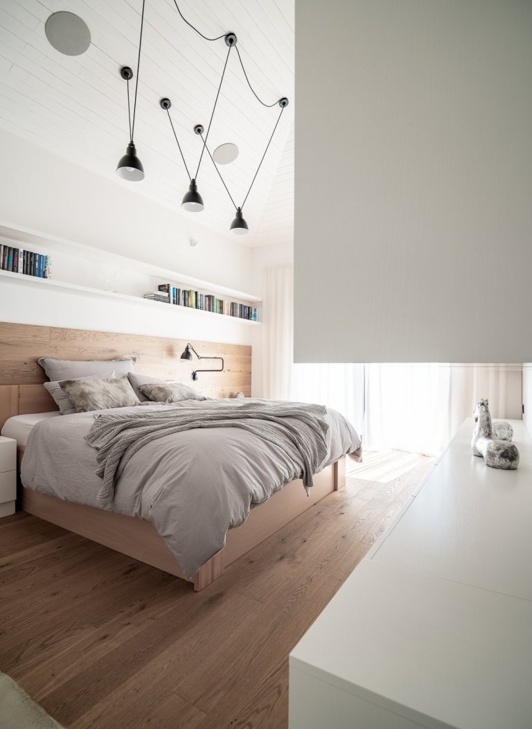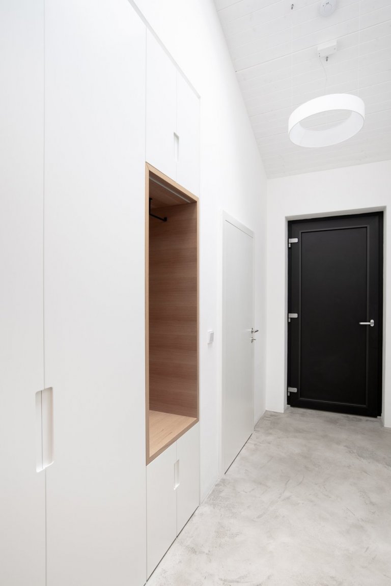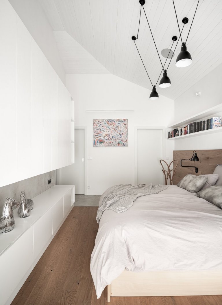 Ložnice & koupelny – obě místnosti byly původní, pouze jsme je doladili pomocí doplňků a drobných úprav. Ačkoliv je ložnice malá, nepůsobí stísněným dojmem. Přičinil se k tomu vysoký strop a světlé barvy. Dřevěné obložení stropu vytvořilo geometrický prvek linií, které pocitově rozbily plochu stropu na menší části. Ten se tak stal zajímavým fragmentem místnosti. Dřevěná podlaha přechází v obložení stěny, která tak podtrhuje samotnou postel vůči protilehlé nábytkové stěně. Aby bílý nábytek nesplýval se stěnou byl podtržen šedou betonovou stěrkou. Pokud hovoříme o čistých liniích, tak nemůžeme opomenout ani dlouhou polici na knihy, čtecí lampičky a výrazné černé osvětlení nad postelí. Pro pocit zútulnění jsme použili lehké voály a lněné povlečení na postel. Umělecké předměty klienta už jen podtrhují celkovou atmosféru místnosti.
