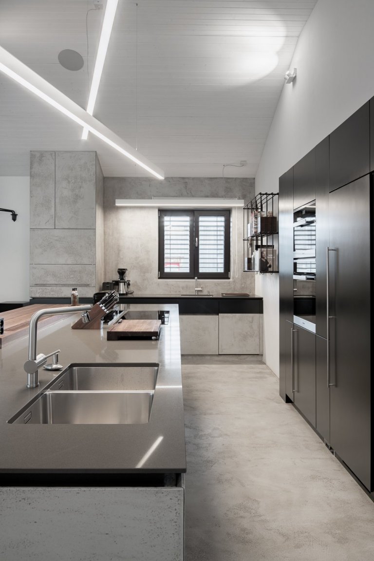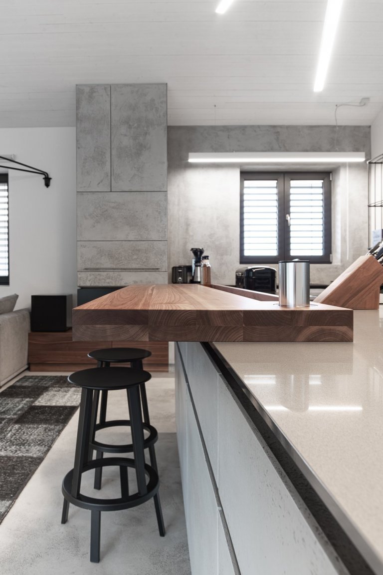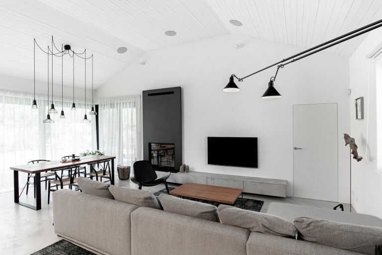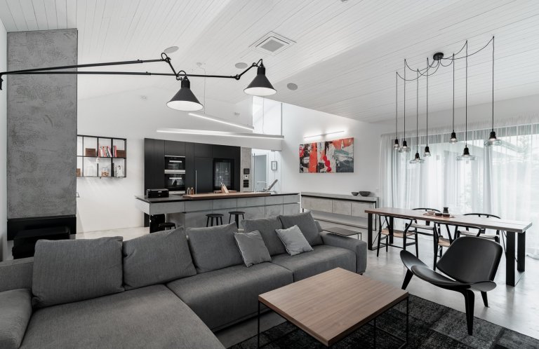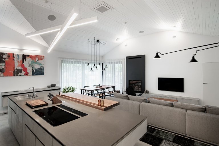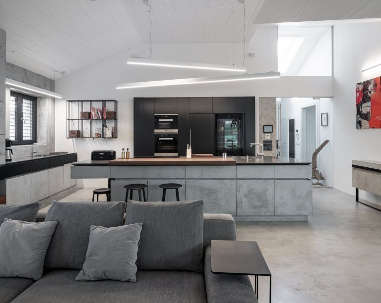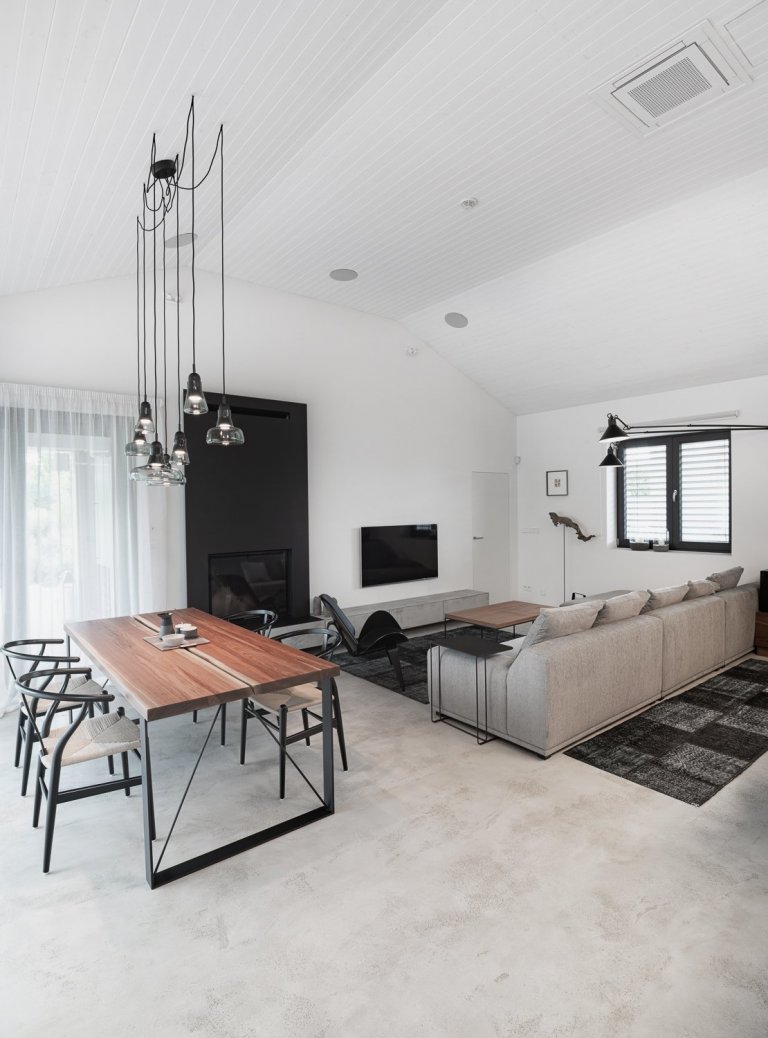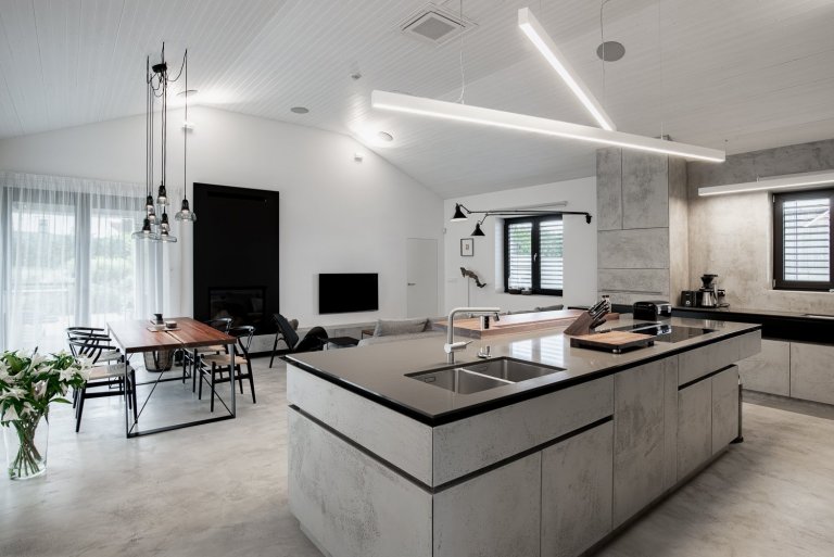 Koncept/ barevnost / materiály – Hlavní myšlenou bylo vytvořit centrální místo domu, které bude středobodem pro přátelská setkání. Otevřený krov jsme opatřili bíle mořeným podbitím, tím jsme se zbavili fádního sádrokartonového podhledu. Velkým plochám dominuje bílá barva na stěnách, stropu a podlaze. Dále pak světle šedá betonová stěrka na nábytku. Pro vytvoření kontrastu jsme použili černé subtilní kovové prvky na kovových podnožích nábytku a osvětlení. Ve větší ploše pak na krbu a kuchyni. Železobetonová kuchyně a komoda na míru jsou unikátem tohoto interiéru. Zástupcem struktury bylo dřevo, konkrétně ořech, který byl použit na komodě, barové desce, jídelním a konferenčním stolku.