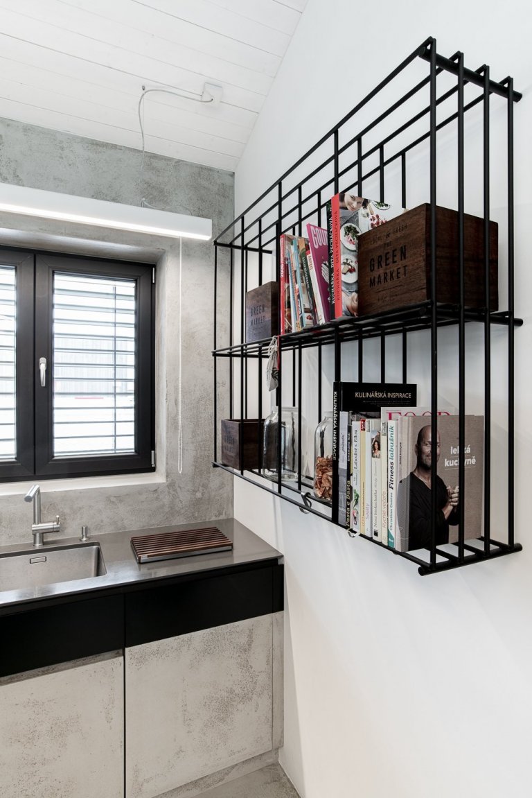 Kuchyně & jídelna – Povrchová úprava kuchyňské linky je betonová stěrka od Němce. Její odlehčený a přísný vzhled umocňují detaily v podobě zkosených hran u čel zásuvek. Pro zachování čistého designu byla použita kombinace bezúchytkového systému tipon s tichým dojezdem a elektrický systém “servo-drive”. Subtilní pracovní deska z umělého kamene se dostává do kontrastu s masivní barovou deskou z ořechu, s místy k sezení pro dvě osoby. Policová sestava z ocelových prutů je elegantním protikladem k masivní železobetonové kuchyni. Jídelní stůl jsme umístili do nejsvětlejšího rohu místnosti. Černá ocelová konstrukce je doplněna o stolovou desku z ořechu. Židle oblého tvaru barevně korespondují se stolem. Osvětlení nad stolem zajistil “pavouk” ze skleněných, natónovaných, různě velkých světel.