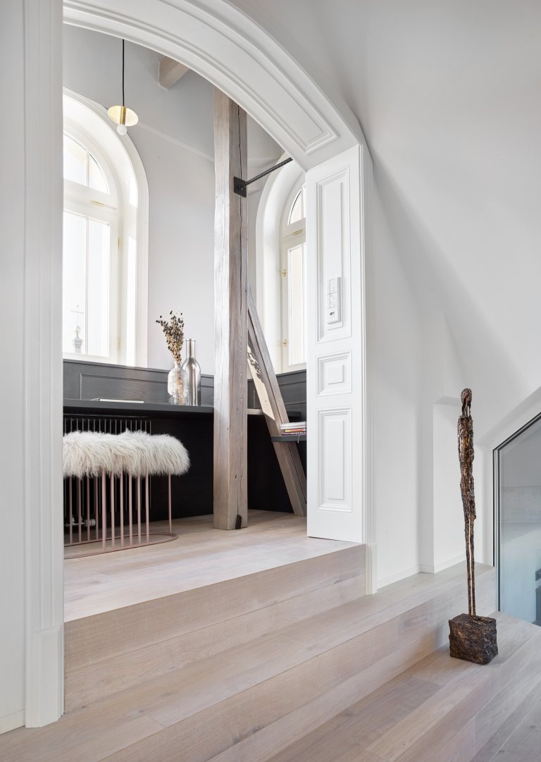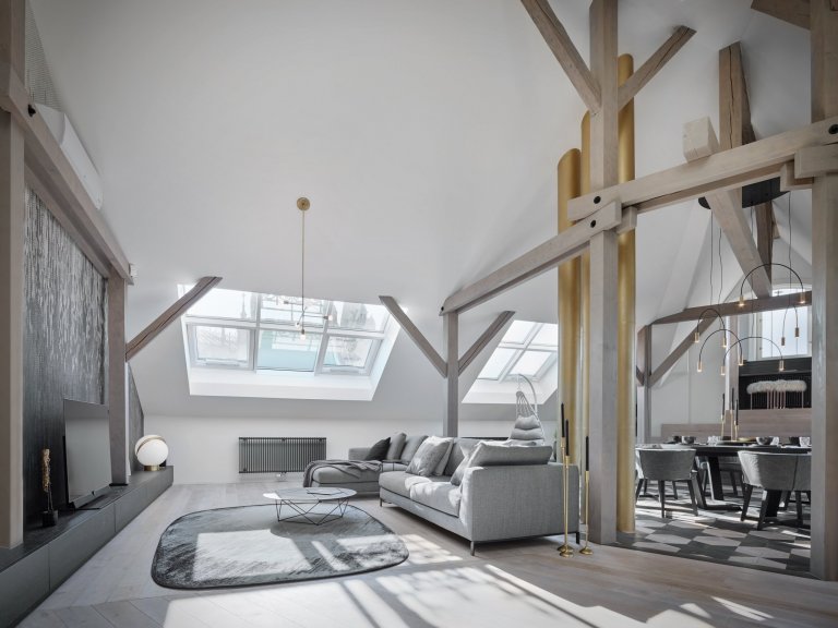 Dispozice – podkrovní byt o rozloze 217 m² prošel kompletní změnou dispozice. Hlavním zásahem bylo otevření zadní části bytu, přičemž se záměrně odhalilo 6 komínů, které se staly dominantou bytu. Centrálním prostorem je tedy jídelna, obývací pokoj s “relax zónou” a kuchyně s kuchyňským ostrůvkem. Byt dále disponuje terasou, třemi ložnicemi, dvěma koupelnami a dvěma samostatnými záchody. Díky vyvýšené pracovně nezůstal zastíněn ani výhled na Staré město a Pražský hrad.
