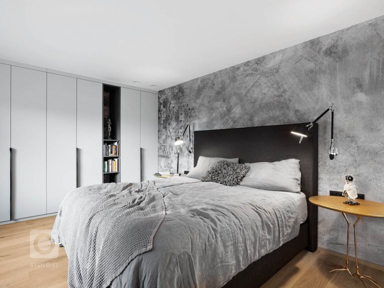 Hlavní ložnice & šatna – Obytné místnosti v soukromé části domu mají dřevěné lepené třívrstvé podlahy v dekoru dubu. Ložnice má vestavné šatní skříně z lakované MDF, ve světle šedé barvě, doplněné o kožené úchytky. Stěna je dekorována tapetou se vzorem od Wall and Deco, na níž vyniká antracitová čalouněná kontinentální postel. Jako noční stolky posloužily jednoduché italské zlaté stoly s ptačími nohami od Cassina. V šatnách lze vidět nábytek z vrstvené dýhy, která je mořená do šeda. Tato metoda se řadí mezi netradiční techniky, při níž vzniká struktura, která nemá obdoby. Opět jsou použity na dvířkách kožené úchytky. Uprostřed šatny se nachází podsvícený ostrůvek, který obsahuje úložné prostory a zároveň slouží jako lavice.