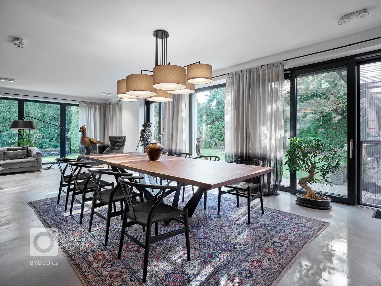 K jídelnímu stolu se může usadit osm až deset osob. Pohodlí si dopřejí na židlích od Carla Hansena – Wishbone.