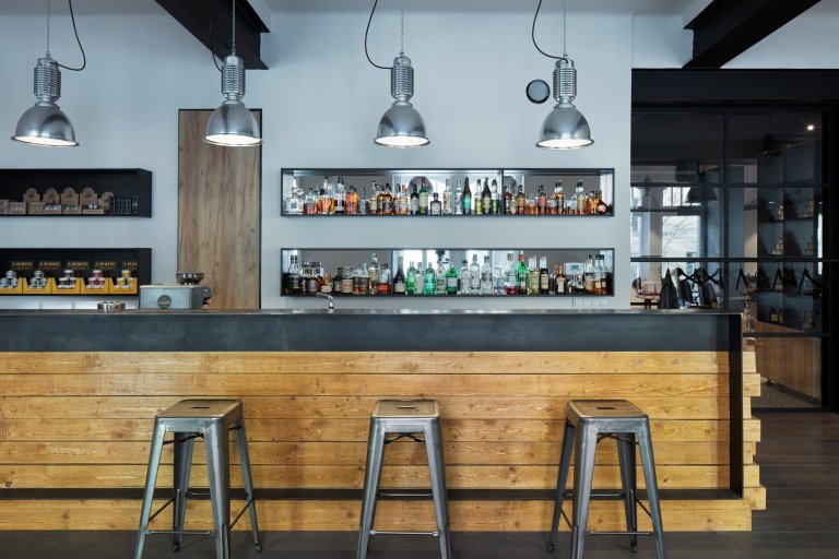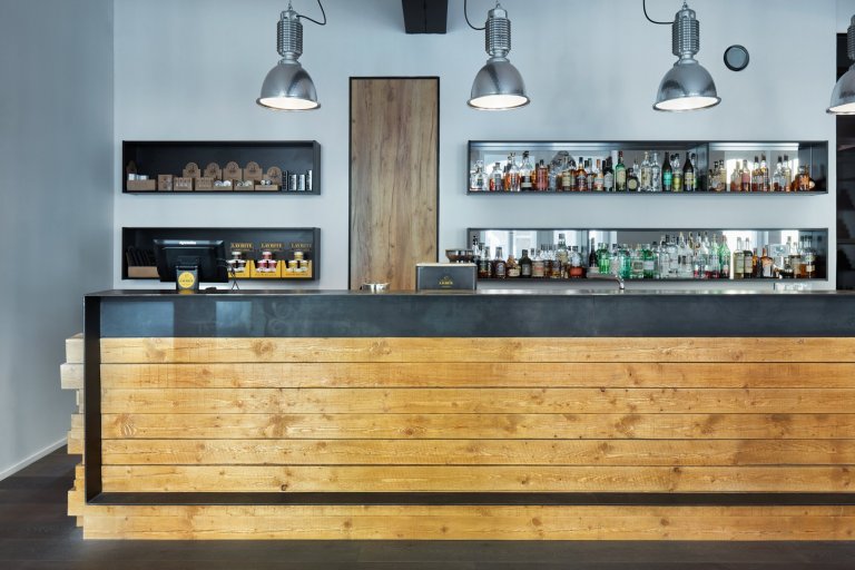 Bar – je proveden s masivním trámů, které mají nepravidelné zakončení boční hrany. Vyvýšený ocelový pult zakrývá provoz baru, zároveň hmota slouží i jako opěrka nohou. Proti baru je umístěna stará kožená sedačka, která odkazuje ke klasickým americkým holičstvím.
