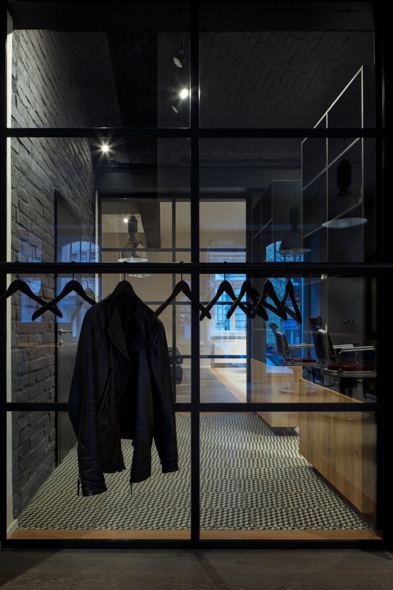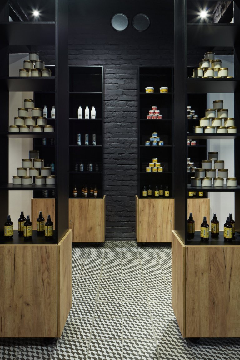Produktový kout – jednotlivé prostory pro holení jsou odděleny tmavým koridorem, který slouží pro prezentaci kosmetických produktů. Z této částí za skleněnou příčkou je přístupná toaleta pro hosty. Povrchy v této části jsou otlučeny na cihlu a opatřeny černou výmalbou. Před skleněnou příčkou jsou osazeny nenápadné tyče, které slouží k odkládání kabátů. V této části je podlaha tvořena výraznou geometrickou retro dlažbou.