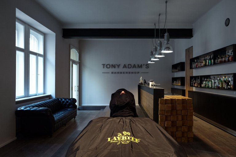 Holící pulty – jsou provedeny ze dvou ocelových traverz, na něž je osazeno umyvadlo a mezi nimi prochází baterie z podlahy. Na traverzy jsou nasazena dřevěná prkna pro odkládání kosmetiky. Zásuvky pro strojky a fény jsou skryty v zadních hranách traverz. Každé holící místo je vybaveno kvalitním sicilským, ručně vyrobeným polohovacím křeslem v retro designu s červenou kůží. Stěny za zrcadly jsou oškrábány na omítku a přes celou stěnu je vždy umístěno zrcadlo. Podlahy v prostoru pro holení jsou provedeny v betonové stěrce.