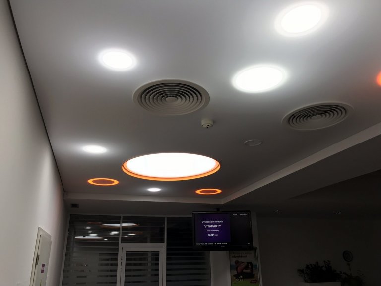 Nad původním kazetovým stropem byly veškeré technologie (vzduchotechnika, kabeláže, apod.), které bylo nutno zachovat a zároveň skrýt. Dle zadání projektu jsme provedli přemístění vzduchotechniky, natažení nové kabeláže, výrobu nového osvětlení a samotnou instalaci uvedeného osvětlení. Tyto technologie jsou skryty nad světlo propustným napínaným podhledem OPTIMUS, ze kterého vystupuje originální designové kruhové svítidlo, které je také vyrobeno ze světlo propustné napínané fólie. Díky speciální konstrukci společně s LED osvětlení jsme docílili atraktivního vzhledu, který zaujme na první i druhý pohled.