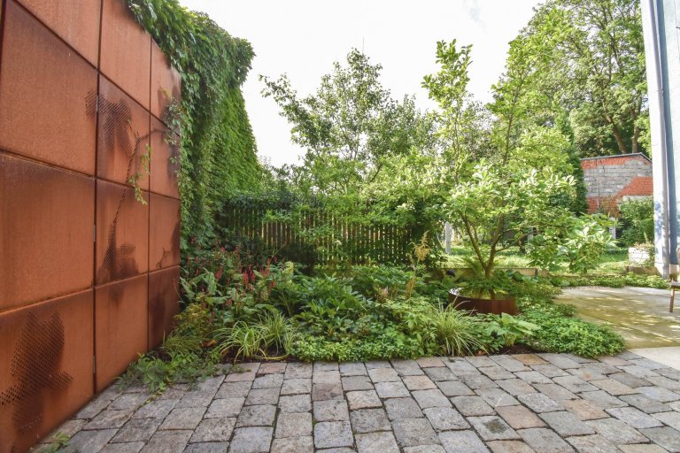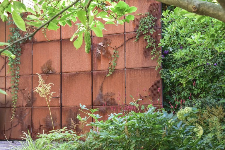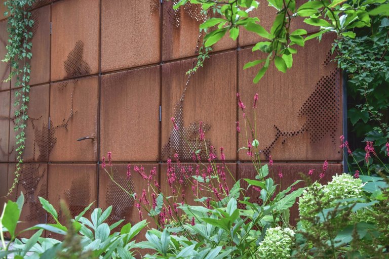 Kovové prvky i se vší rzí jsou ponořeny do trvalkového listí pachysandry, rákosovky a kontryhele, bránu pomalu popíná loubinec. V záhonech během roku zasvítí květy hortenzií a pivoněk. Drobné kvítky česneků, rdesna, kuklíků, sasanek a ploštičníku zaručují, že po celý rok je čím se kochat. Dokonce i přes zimu zde žhne barva kovu a probarvuje atrium nečekaným odstínem červené.