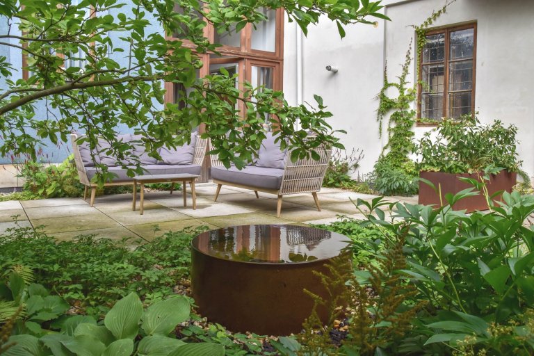 Kámen, kov, vodní plocha, okolní fasády, stín… To se může někomu zdát poněkud chladné a tvrdé. Není tom tak, během roku se prostřídají barvy stínomilných rostlin v zeleném koberci se závojem pnoucího listí a baldachýnem větví.