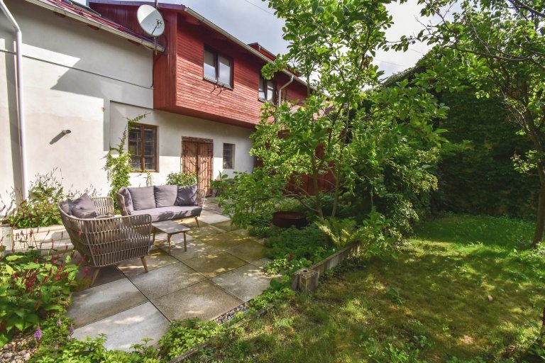 Hlavním prvkem tady však překvapivě není zahradní nábytek, dlažba ani zeleň, ale kovová brána. Celou jednu stěnu dvorečku totiž tvoří kortenový paraván s ukrytými dveřmi. Do něj jsme vtiskli perforaci ve tvaru kvetoucích větví Šácholanu (neboli Magnolie :)). Industriální prvek kazetové stěny, sochařsky dokreslený přírodním motivem doplňuje vodní prvek, kortenovou mísou ve stinném záhonu a několik truhlíků ze stejného materiálu v zádech sezení.