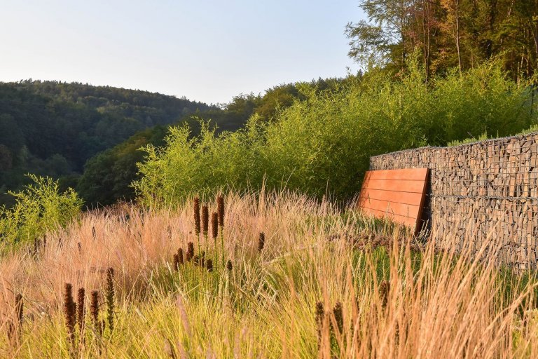 Další z teras je pokryta jednoduchým travino - trvalkovým záhonem, ve kterém je schováno malé intimní sezení s ocelovým ohnišťátkem. Nálada je tu zcela jiná než na pohovce u domu. Místo je skryto proti pohledům i větru za hradbou stálezelených bambusů a tím je zde vytvořeno úplně ideální oddechové místečko pro posezení ve dvou, třeba u vína.