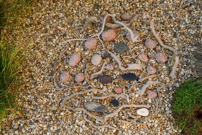 Suchomilná vegetace a jednoduché štěrkové záhony jsou postupně doplňovány o řadu artefaktů, lapiček, větví a kamenů z cest, kterými paní majitelka postupně citlivě zabydluje vybraná místa a zákoutí. Tyhle malé instalace musíte ovšem trochu hledat …