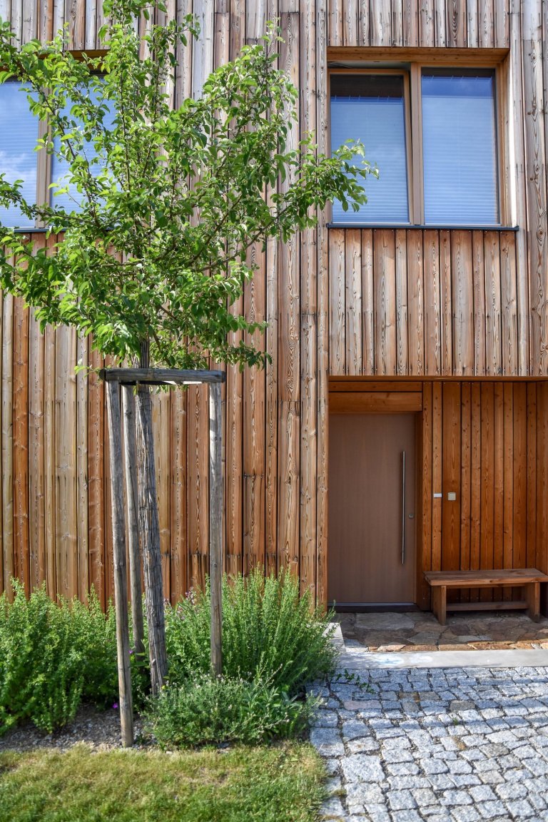 Čas v této zahradě plyne svým tempem a ona se pomalu mění. Jak jsme již zmínili, dnes jí dominuje stará třešeň, jednou ji vymění ovocné stromy… Fasáda zajde ještě sytějším odstínem šedé a dům definitivně splyne se svým okolím.