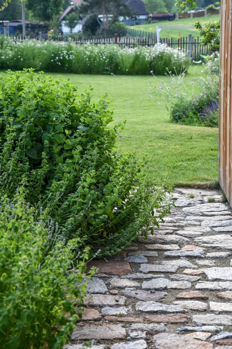 Na terasu navazuje další cesta - ta za domem. Touto půvabnou stezkou z přírodního mlatu se dostaneme k hlavní pěstební části. Zde má paní domu umístěny bylinky, rajčata, cukety, hrášek a také kompostér.
