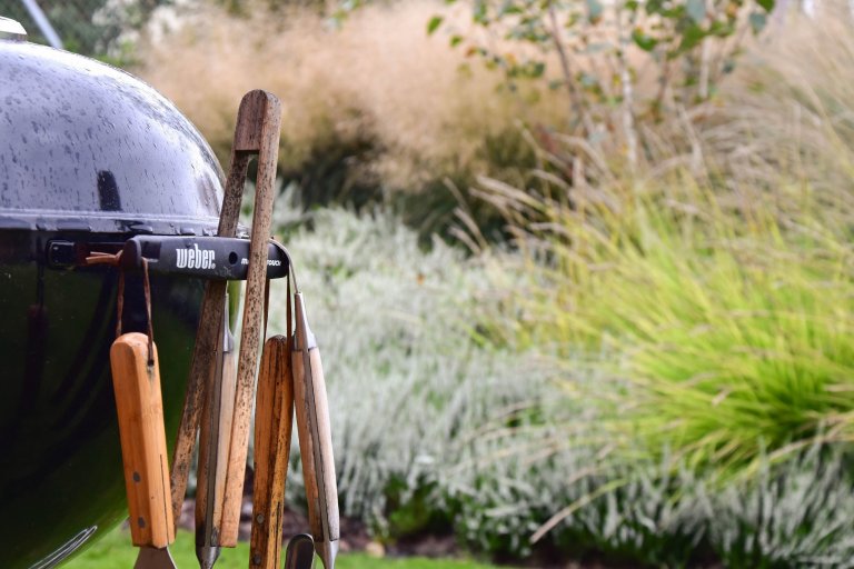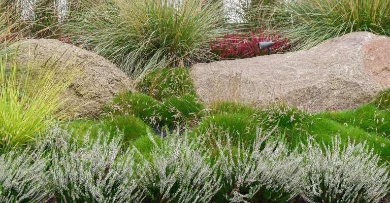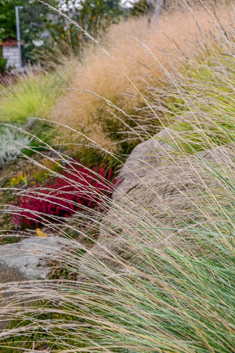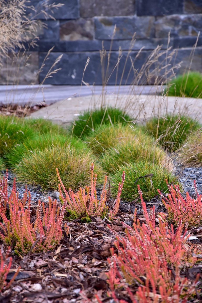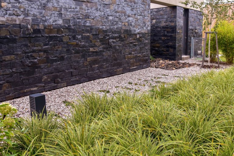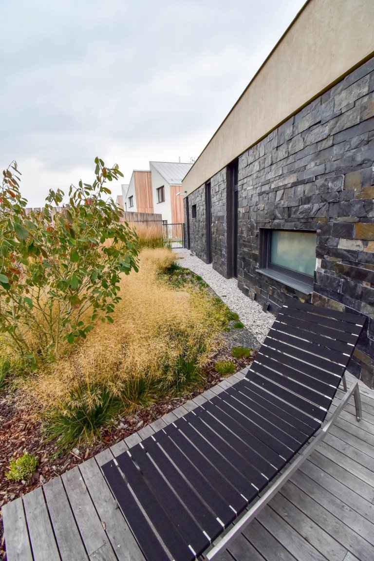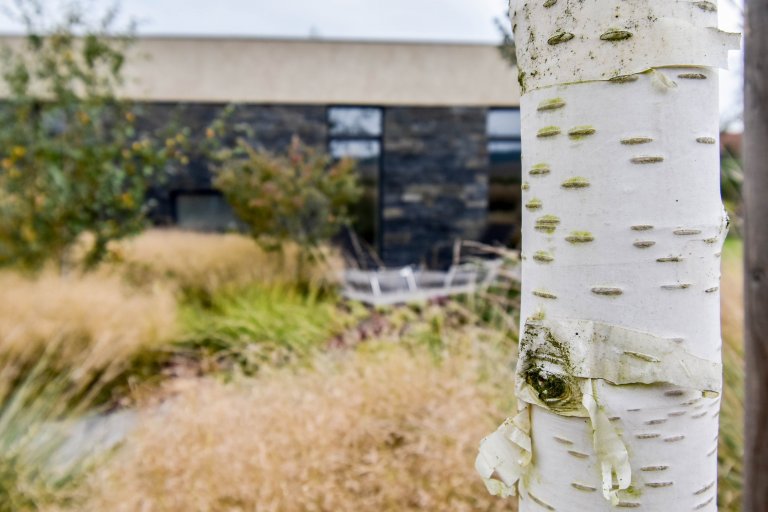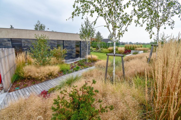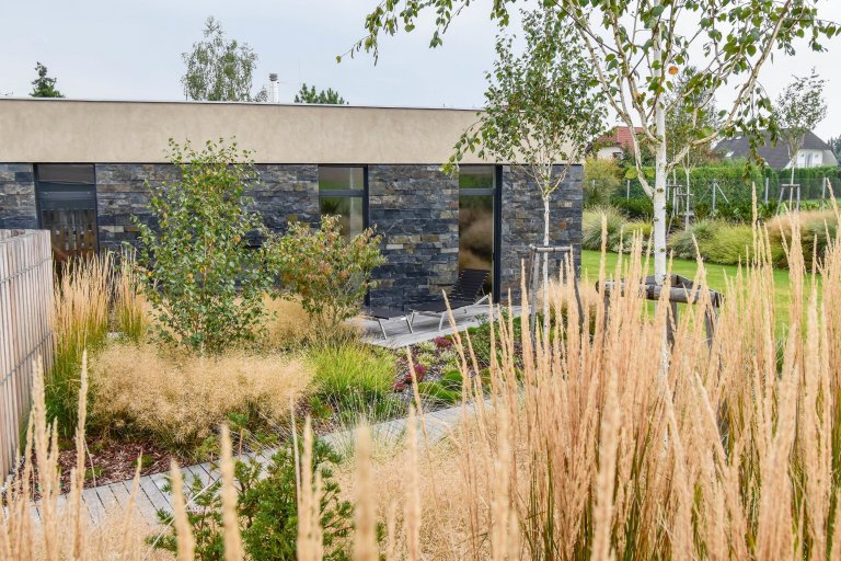 Šedá je úžasná v tom, že dává vyniknout ostatním barvám. A tak jsme na ni záměrně navázali jednoduchou zahradou s lehce severskou atmosférou z travin , vřesů a vřesovců, které jsou doplněny o stromové patro z bříz, které s tmavým obkladem krásně kontrastují.