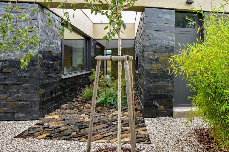Kamenné atrium s ostrůvky trvalek, travin a kapradin je komponováno na důležité pohledy z interiéru – vstupní haly a kuchyně. Výsadby jsou nasvíceny a solitérní pískovcový balvan, který se zde opět objevuje, slouží i jako přírodní pítko. Zahradu zakončují stálezelené bambusy a traviny, které ji uzavírají a doplňují stinnou část zahrady.