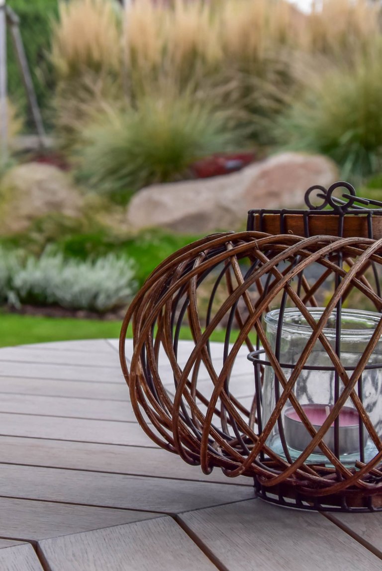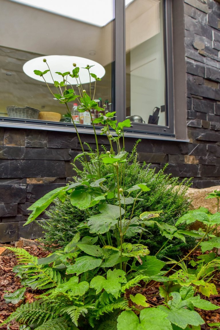 Soukromí budou v budoucnu zajišťovat stálezelené keře, které zahradu doplňují v důležitých pohledech. Na ty je však ještě brzy, ke svému účinku potřebují čas. Velkým tématem této zahrady bylo použití pískovcových balvanů, které doplňují výsadby v pohledově důležitých a provozně navštěvovaných místech.