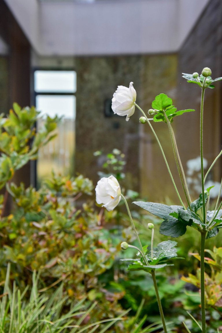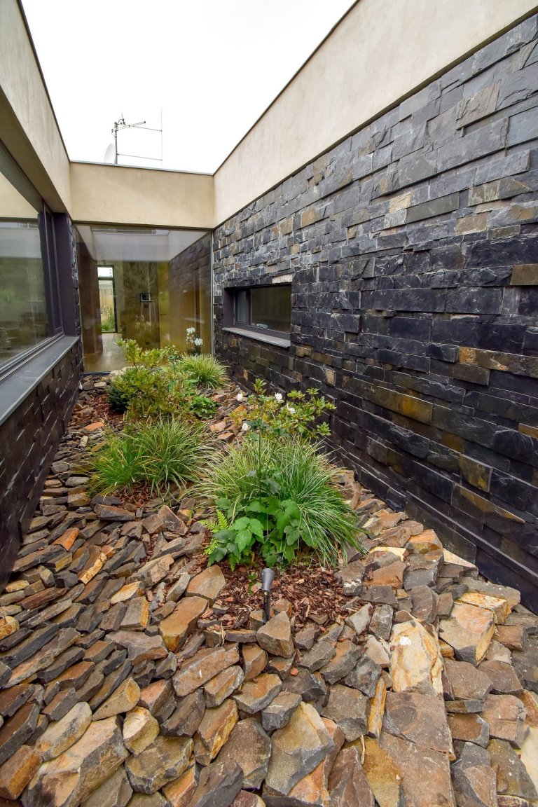 Slunnou atmosféru kamenů a vřesů jižního zahradního průčelí doplňuje kontrastně řešené atrium na severní straně domu.