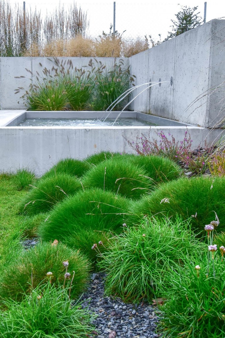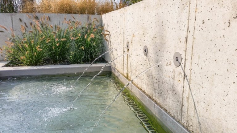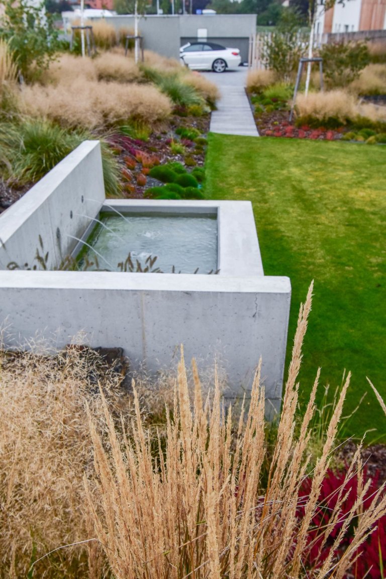 Na trávník navazuje v ose i vodní prvek, navržený ve formě jednoduché, minimalistické betonové vany s vodními střiky.