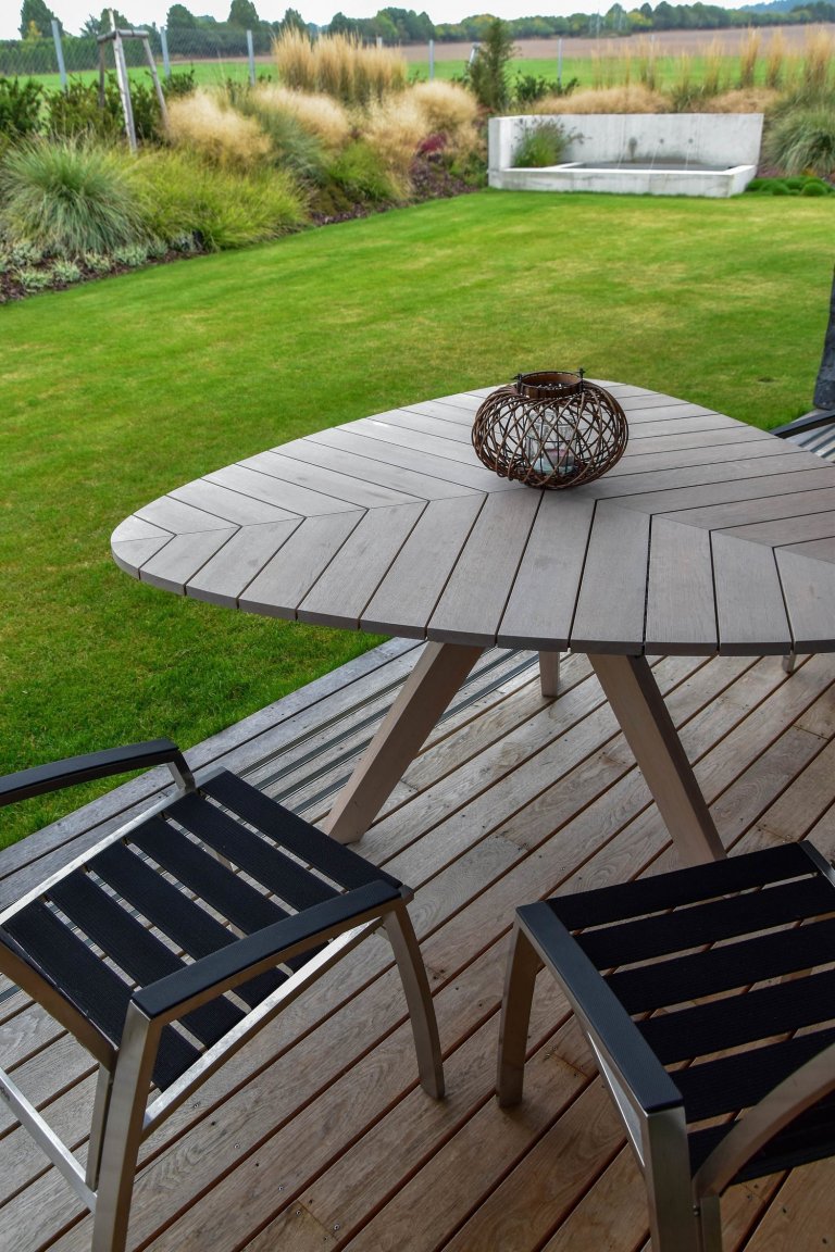 Travnatá plocha je vzhledem k velikosti pozemku přiměřeně dimenzována a navazuje na pobytovou terasu, na které rodina tráví nejvíc času - je zde umístěno zahradní sezení a skrytá vířivka za posuvnou lamelovou stěnou.