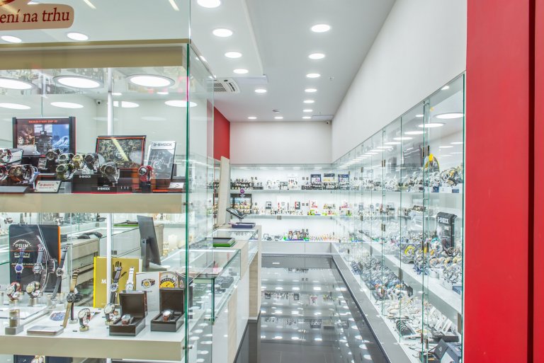 Cílem projektu bylo vytvoření dojmu plynulé návaznosti mezi zdí a sklem. Pro vytvoření jedné roviny jsem doporučil ze skla vytvořit i nosný prvek samotných polic. Na těchto nosných příčkách jsou přilepeny panty. V celé prodejně jsou instalovány elektronické zámky s přístupem přes čipovou kartu.