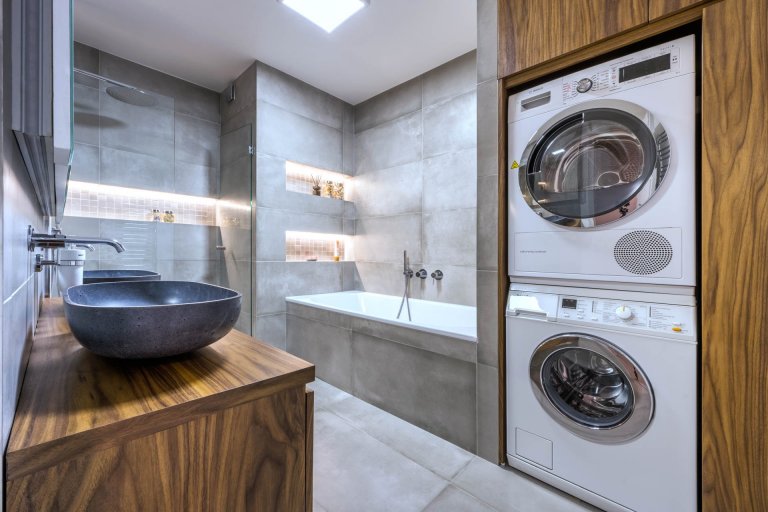 Mezi požadavky zazněla i nutnost umístit do koupelny pračku se sušičkou. Prostor kolem nich využil architekt Jindřich Kobr k poskytnutí velkorysých úložných prostor. Koupelna je díky tomu multifunkční, ovšem především se v ní rodina cítí velmi komfortně. Každá návštěva je totiž připomínkou dobře odvedené práce i kvalitní spolupráce.