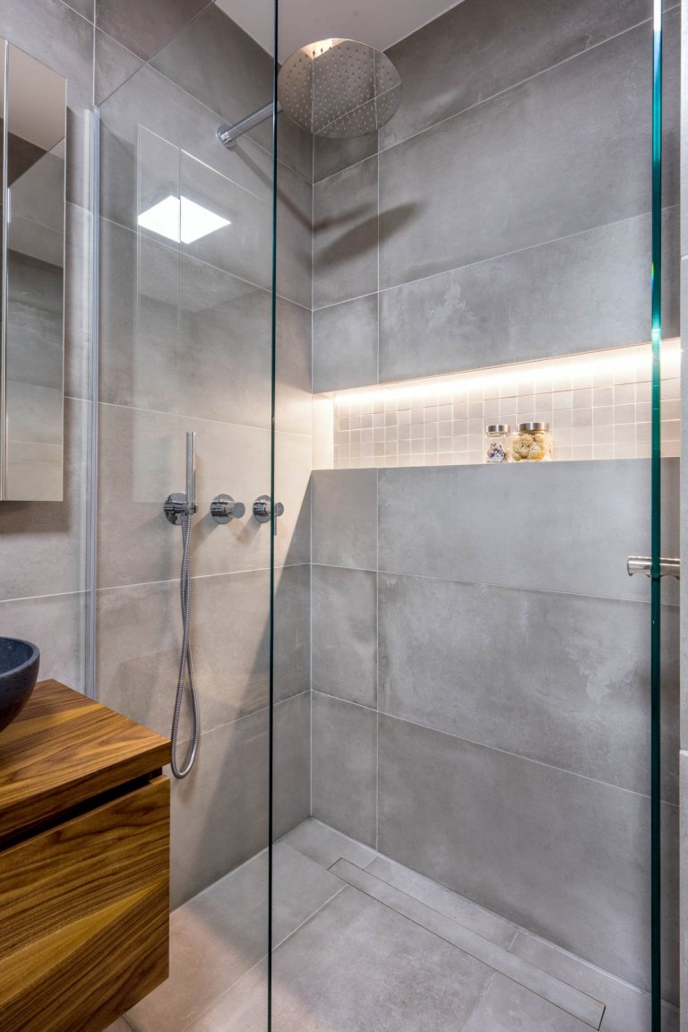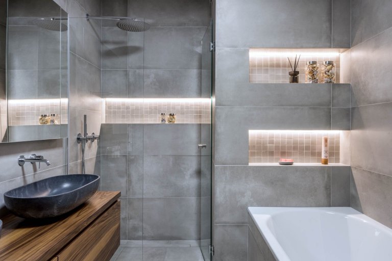 Převážně oválný tvar doplnily praktické čtverhranné niky se stylovým podsvícením. Zabydlela se v nich mozaika, která tak narušuje masivní šedé plochy.