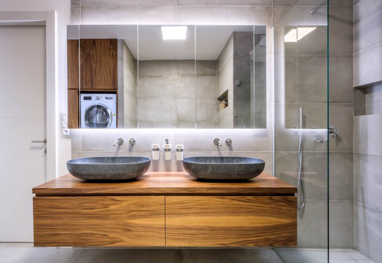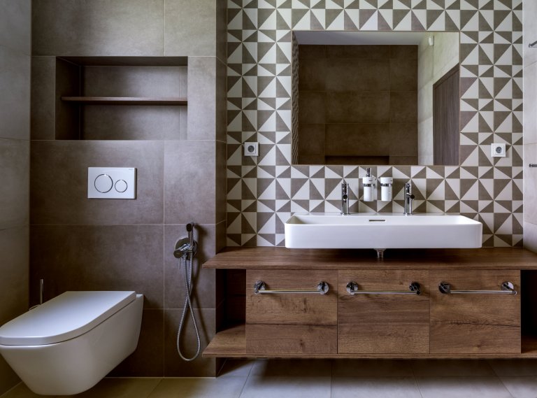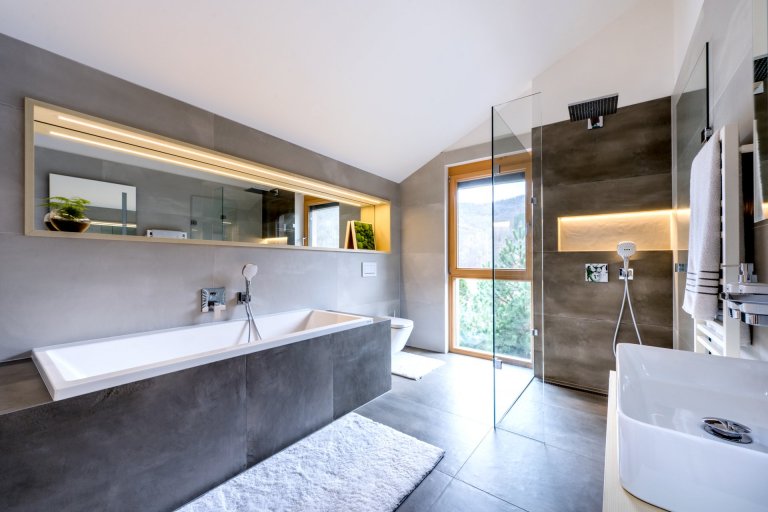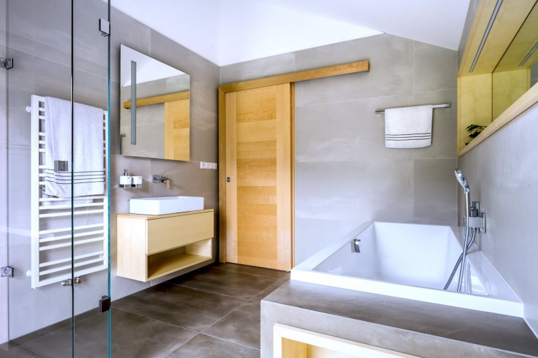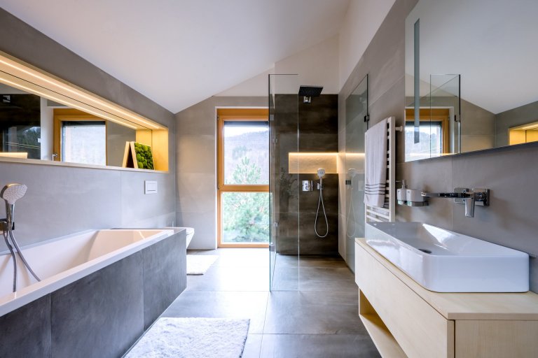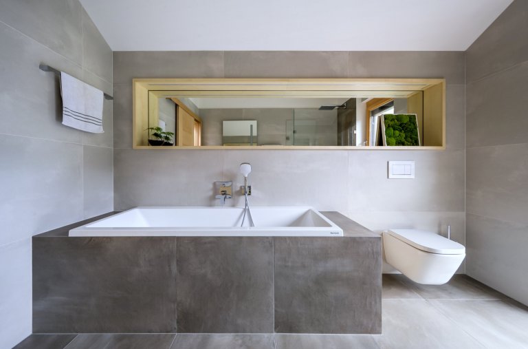 Pro celý návrh je klíčová přítomnost velkého okna, které do koupelny vnáší denní světlo. Díky němu bylo možné prostřídat světlejší dlažbu v imitaci stěrky s dlažbou tmavší. Pohled z okna také vybízel k umístění veliké vany s výhledem do zeleně. Stěně nad ní dominuje odkládací nika se zrcadlem, které prostor ještě více opticky zvětšuje. K orámování niky posloužilo stejné světlé dřevo, jaké najdeme nejen u skříňky pod umyvadlo na desku, ale také ve výplni praktické odkládací plochy, která je šikovně ukrytá za vanou směrem k toaletě.
