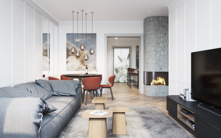 Nové bydlení pro našeho klienta se nachází v novém rezidenčním projektu na pravém břehu Vltavy. Nejvyšší podlaží penthousu je lemováno střešními terasami s neomezeným výhledem na pražské panorama. Naším záměrem bylo vytvořit prostor zabezpečující pohodlí a funkčnost.
