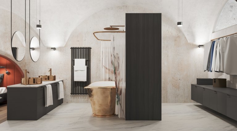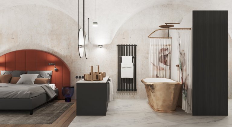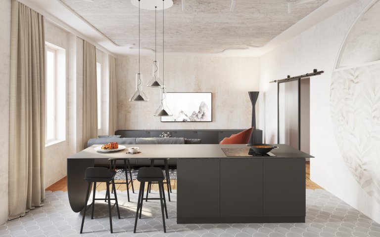 Místo, historie, atmosféra, všechny tyto aspekty hrály při návrhu interiéru roli. Dochované části domu, které vypovídají o jeho vývoji jsme ponechali viditelné – zdivo, štuk a klenby. O to působivější je jejich kombinace se soudobými prvky a moderním tvaroslovím, které v kontextu budovy odlišuje projekt od všech ostatních v jeho mimořádnosti.