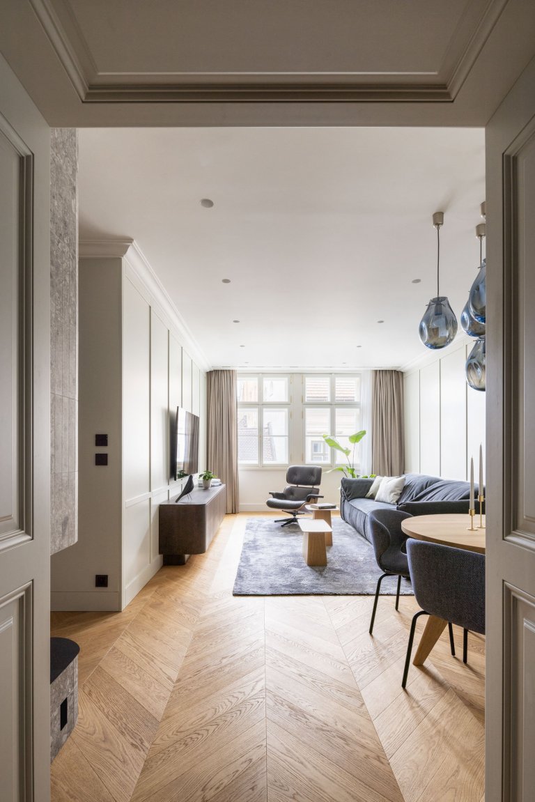 Majitelé bratislavského bytu tráví většinu roku na cestách. Od nového bydlení proto očekávají, že se stane základnou pro jejich kosmopolitní způsob života, odkud mohou vyrážet do celého světa. Vzhledem k historické lokalitě chtělo studio bytu navrátit jeho původní charakter, který podtrhuje vysoký standard bydlení. Investor neměl v úmyslu dělat kompromisy. Čekal nás proto náročný úkol s členěním prostoru tak, abychom v interiéru promítli vše, co si klient přál: dostatek úložných prostor v každé části bytu, krb, dva dětské pokoje, ložnice s walk-in šatnou, technická místnost a v neposlední řadě také tři koupelny.