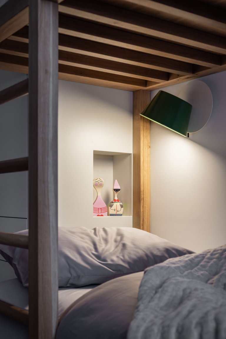 Soukromá, intimní část bytu je oddělená od té společenské, kde se nacházejí tři ložnice a dvě plnohodnotné koupelny. Obývací pokoj s ložnicemi propojuje chodba, jejíž stěnu lemují atypické vestavěné skříně, které rodina se třemi dětmi pro ukládání nezbytností ocení. Přiléhajícím dětským pokojům vévodí na míru navržený atypický nábytek s měkkým kobercem na podlaze. Poslední ložnicí v bytě je ta rodičovská, na kterou navazuje walk-in šatna. Pro ucelenost interiéru zde opakujeme prvky kazetového obkladu a zrcadel na stěnách.