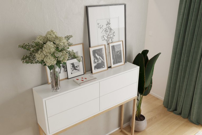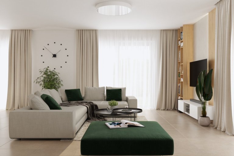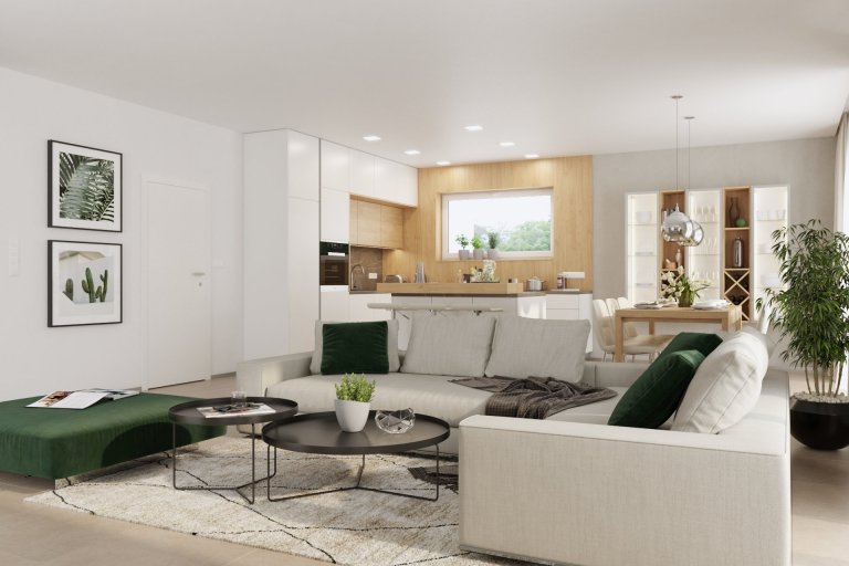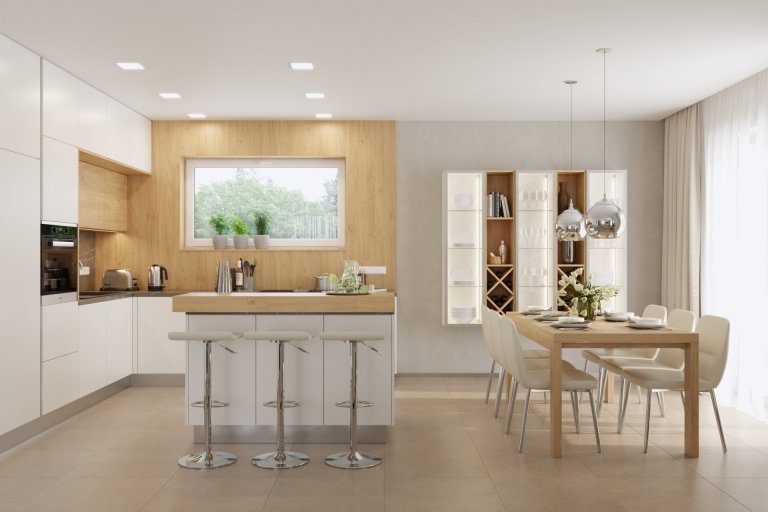 Dennej zóne dominuje otvorený priestor, ktorý spája kuchyňu, jedáleň a obývaciu izbu do jedného harmonického celku. Svetlé farby a veľké okná zaisťujú dostatok svetla a vizuálnu prepojenosť s exteriérom.