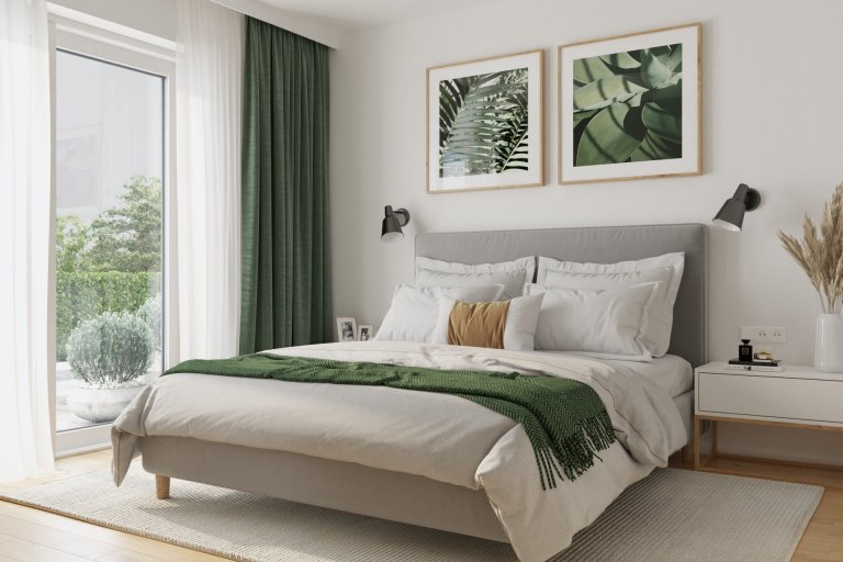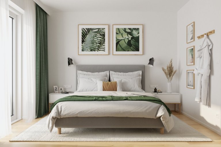 Hlavná spálňa je navrhnutá ako centrum pokoja a oddychu s priamym prístupom k šatníku. Šatník je riadne organizovaný s dôrazom na funkčnosť a optimalizáciu priestoru.