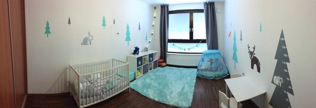 Dětský pokojík 16m2 určený ročnímu dítěti. Rodiče volili bílou výmalbu s bílým nábytkem v kombinaci s krásnou tmavou podlahou v teplém odstínu dřeva. Zdi jsou ozdobené samolepkami z naší lesní kolekce. Barevnost pokojíku dodávají nejen tyto samolepky, ale i hračky, které lze vidět v regálu.