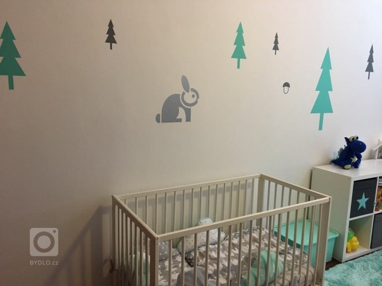 I nad klasickou dřevěnou postýlkou v bílé barvě zdobí zeď samolepky z lesní kolekce.