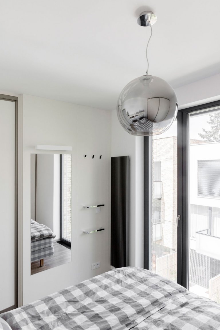 Interiér bytu v Černošicích jsme navrhli jako záměrně tlumeně barevný, s důrazem na jednoznačné linie. Naším záměrem bylo vytvořit vizuálně čistý a tvarově jasně definovaný prostor, který by dal vyniknout největšímu benefitu celého bytu - panoramatickému výhledu do okolí skrz francouzská okna. Na jejich velké skleněné plochy navazuje rovina stěn a vestavěného nábytku, jež do sebe navzájem plynule přecházejí. Nábytek a další zařizovací prvky jsou tvarovány velmi racionálně. Hlavní prostor je koncipován jako obývací, s jídelní částí a kuchyňským koutem.