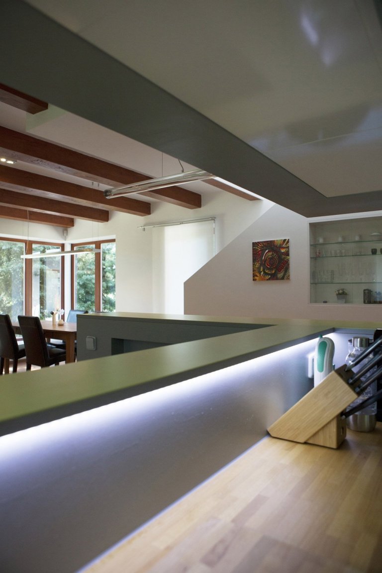Prostorově členitou místnost plnou spletitých částí a zařizovacích prvků bylo zapotřebí důkladně vyčistit, zbavit ji ducha skladiště a naopak jí vtisknout pocit rodinného "chrámu". Toho se podařilo dosahnout jen odvážným a razantním architektonickým řešením, které zachovalo z původní místnosti pouze nosné prvky a dřevěné trámy. Ostatní použité materiály, tvary a doplňky byly navrženy v duchu racionality a jednoduchosti. Tato transformace nezůstala pouze u přeměny interiéru, ale zcela pozitivně ovlivnila i majitele rodinného domu.